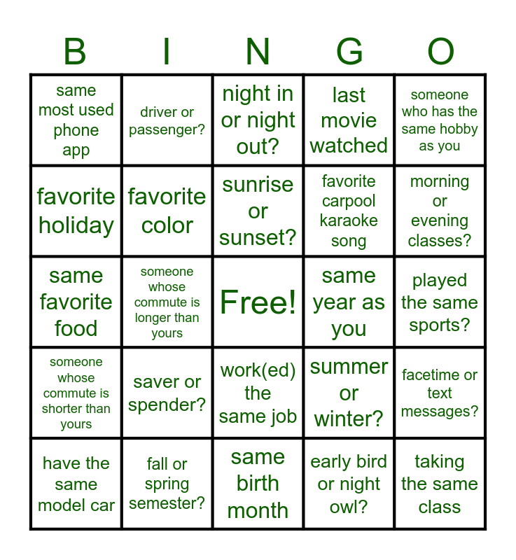 This bingo card has a free space and 29 words: have the same model car, favorite spot on campus, someone whose commute is longer than yours, same dream vacation, same most used phone app, night in or night out?, favorite color, saver or spender?, same year as you, fall or spring semester?, played the same sports?, taking the same class, same birth month, early bird or night owl?, morning or evening classes?, favorite Stevenson event, work(ed) the same job, someone whose commute is shorter than yours, someone who has the same hobby as you, same favorite food, summer or winter?, same pet peeve, favorite carpool karaoke song, favorite holiday, last movie watched, driver or passenger?, facetime or text messages?, sunrise or sunset? and introvert or extrovert?.