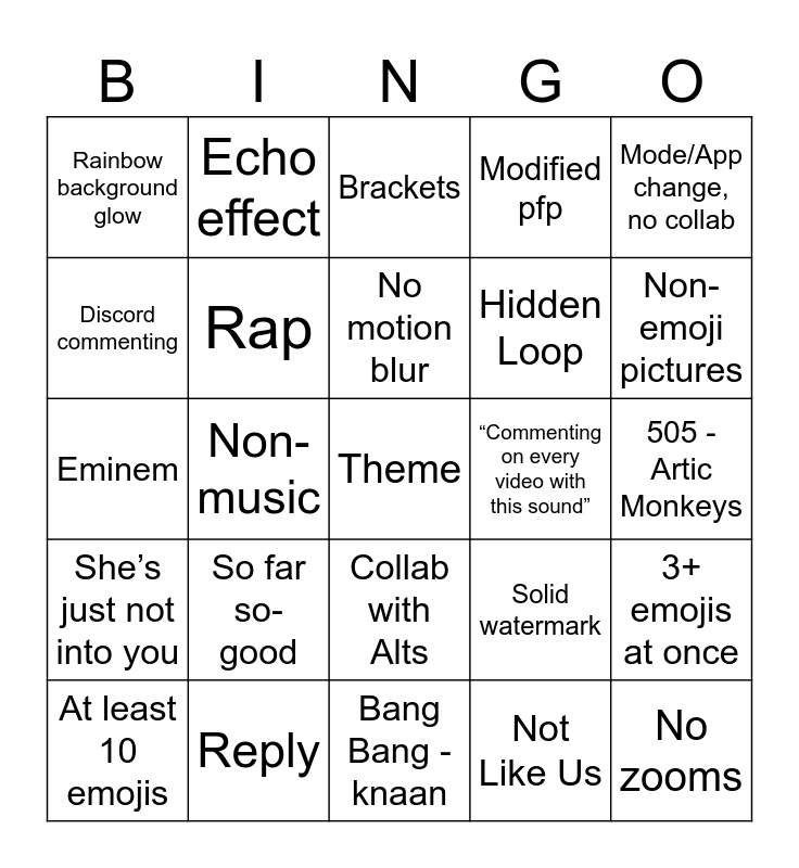 This bingo card has a free space and 39 words: 4+ people collab, Notion, Collab w/ blank comment section, Rap, At least 10 emojis, Collab with Alts, No motion blur, Random people collab, Mode/App change, no collab, She’s just not into you, Non-music, Modified pfp, No zooms, 505 - Artic Monkeys, “Commenting on every video with this sound”, So far so-good, “Username”, Rainbow background glow, Obvious loop, Solid watermark, Discord commenting, Bang Bang - knaan, Hidden Loop, Non-emoji pictures, Colored text, Change in font, Non-English, Non-Sunglasses Sunglasses effect, Letter by letter, Echo effect, Commenting Emojis, Moving Comments, Brackets, Reply, Not Like Us, Comment on their own video, 3+ emojis at once, Eminem and Shake.