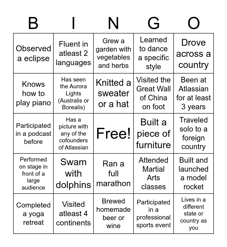 This bingo card has a free space and 24 words: Swam with dolphins, Visited atleast 4 continents, Knitted a sweater or a hat, Completed a yoga retreat, Drove across a country, Observed a eclipse, Knows how to play piano, Fluent in atleast 2 languages, Built a piece of furniture, Ran a full marathon, Visited the Great Wall of China on foot, Participated in a podcast before, Attended Martial Arts classes, Built and launched a model rocket, Has seen the Aurora Lights (Australis or Borealis), Participated in a professional sports event, Traveled solo to a foreign country, Grew a garden with vegetables and herbs, Been at Atlassian for at least 3 years, Has a picture with any of the cofounders of Atlassian, Lives in a different state or country as you, Performed on stage in front of a large audience, Learned to dance a specific style and Brewed homemade beer or wine.