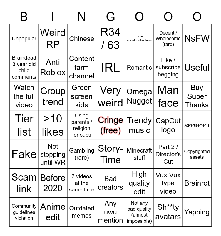 This bingo card has a free space and 48 words: High quality edit, Like / subscribe begging, Any uwu mention, >10 likes, Green screen kids, Advertisements, Weird RP, Anime edit, Decent / Wholesome (rare), Story-Time, NsFW, R34 / 63, Man face, Omega Nugget, Scam link, CapCut logo, Braindead 3 year old child comments, Useful, Vux Vux type video, Fake cheaters/hackers, Romantic, Using parents / religion for subs, Unpopular, Anti Roblox, Brainrot, Content farm channel, Buy Super Thanks, Community guidelines violation, Very weird, Group trend, Sh**ty avatars, Trendy music, Copyrighted assets, Before 2020, Tier list, Minecraft stuff, Part 2 / Director's Cut, Watch the full video, Gambling (rare), 2 videos at the same time, Fake, Yapping, Chinese, Outdated memes, IRL, Bad creators, Not stopping until WR and Not any bad quality (almost impossible).