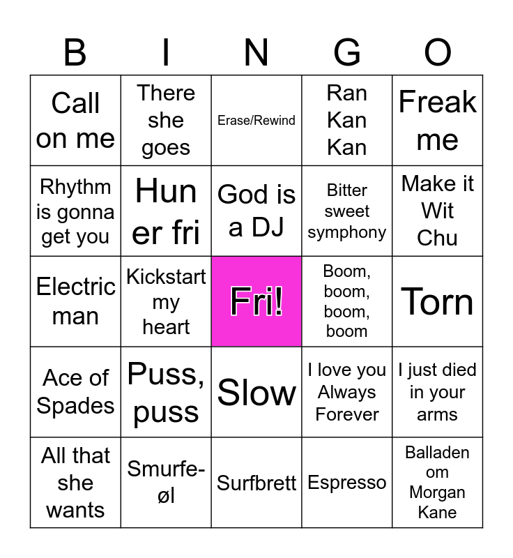 This bingo card has a free space and 34 words: Changes, Espresso, Water, Rasputin, Ace of Spades, Hun er fri, Freak me, All that she wants, There she goes, Ghetto Superstar, God is a DJ, Erase/Rewind, Pedro, Pass the Dutchie, Boom, boom, boom, boom, Make it Wit Chu, Smurfe-øl, Electric man, Puss, puss, I love you Always Forever, Slow, Plukka plommer i Hardanger, Call on me, Torn, Surfbrett, Balladen om Morgan Kane, Ran Kan Kan, Believe, Bitter sweet symphony, Rhythm is gonna get you, Walk like an Egyptian, Kickstart my heart, I just died in your arms and I swear.