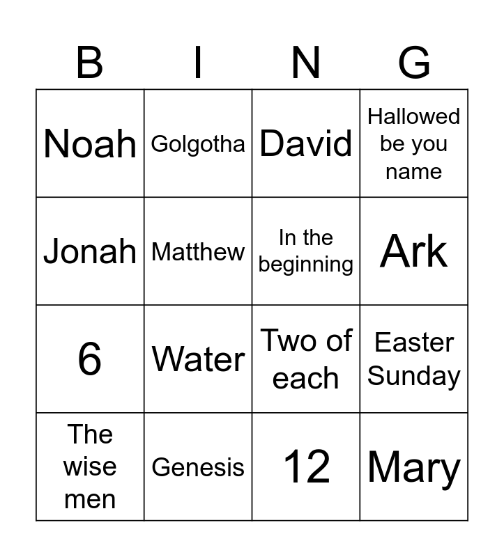 This bingo card has 16 words: The wise men, Genesis, David, Hallowed be you name, Jonah, Golgotha, Two of each, Easter Sunday, Noah, Matthew, 12, Ark, 6, Water, In the beginning and Mary.