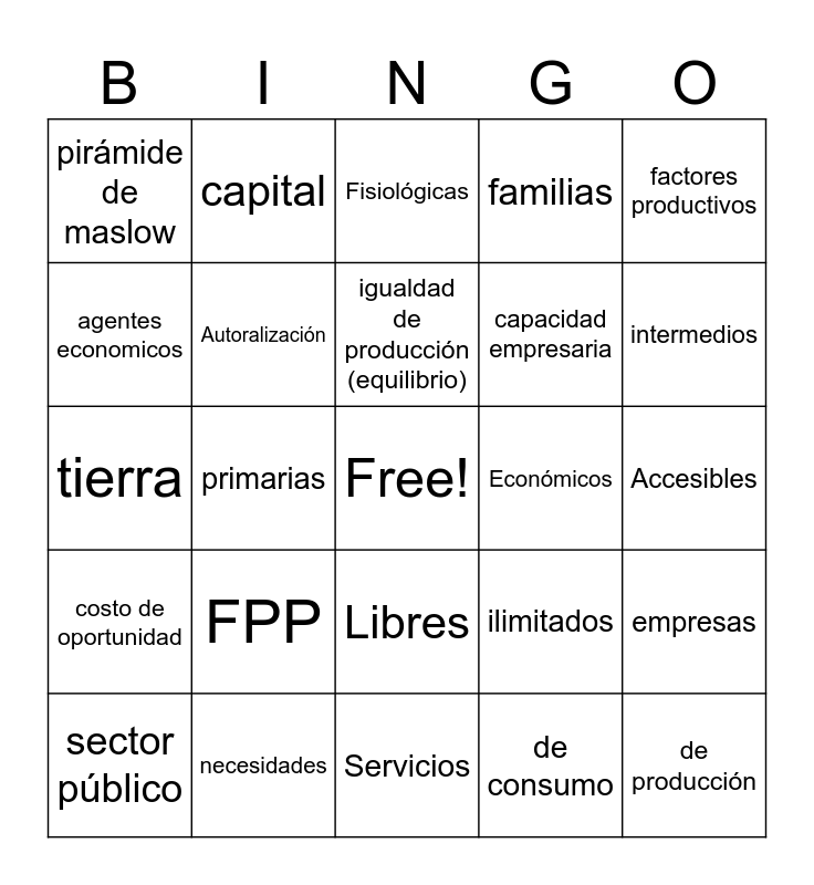 This bingo card has a free space and 30 words: necesidades, bienes, primarias, secundarias, pirámide de maslow, Fisiológicas, Autoralización, Libres, Económicos, Servicios, Accesibles, de producción, de consumo, segun su duracion, intermedios, finales, ilimitados, costo de oportunidad, FPP, factores productivos, tierra, trabajo, capital, capacidad empresaria, agentes economicos, familias, empresas, sector público, igualdad de producción (equilibrio) and cóncava.