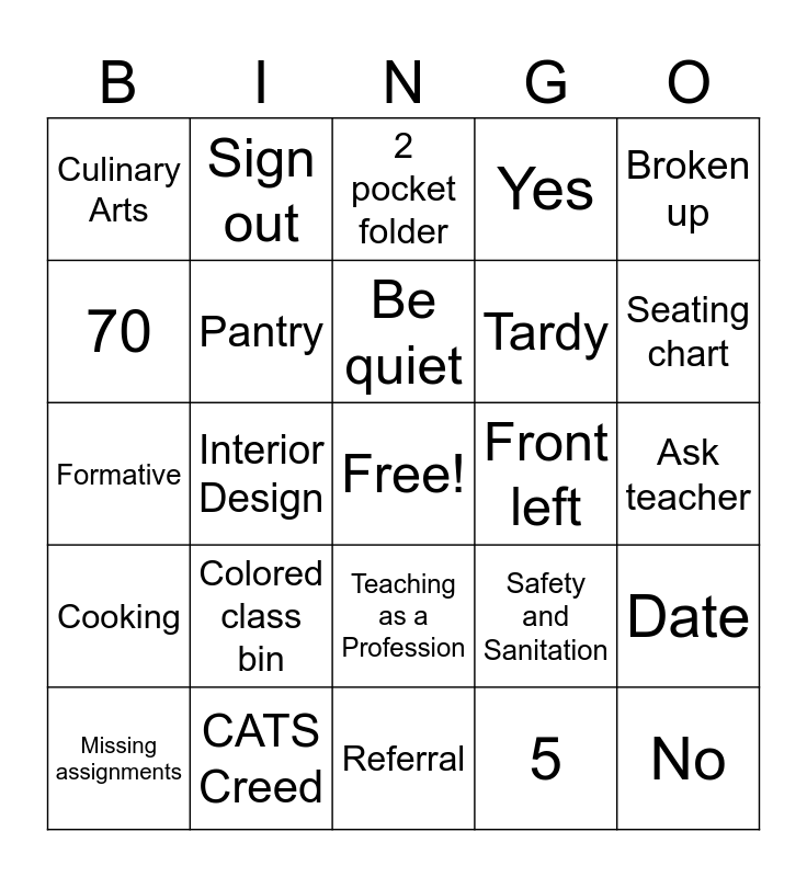 This bingo card has a free space and 41 words: Summative, Formative, Closet, Pantry, CATS Creed, Teaching as a Profession, Be quiet, Get up and walk around, Broken up, Cooking, Interior Design, Yes, No, Ask teacher, Front left, Colored class bin, Grey bin, Culinary Arts, Signed syllabus, 2 pocket folder, Date, Absent, Referral, Tardy, Step, Administration, 5, Warm-up, Seating chart, Under table, Pass, Sign out, Missing assignments, Early Childhood Education, Safety and Sanitation, 70, 85, Fashion Design, Projects and tests, Daily work grades and Emergency.
