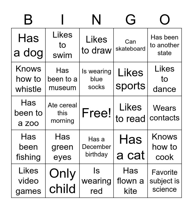 This bingo card has a free space and 24 words: Has green eyes, Only child, Is wearing blue socks, Likes video games, Has been to another state, Has a dog, Knows how to whistle, Likes to swim, Likes to read, Has a December birthday, Likes sports, Has been to a zoo, Has a cat, Knows how to cook, Has been to a museum, Has flown a kite, Wears contacts, Likes to draw, Likes to dance, Ate cereal this morning, Favorite subject is science, Has been fishing, Can skateboard and Is wearing red.