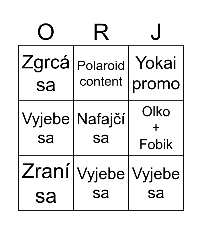 This bingo card has a free space and 8 words: Olko + Fobik, Yokai promo, Polaroid content, Zraní sa, Zgrcá sa, Vyjebe sa, Vyjebe sa and Vyjebe sa.