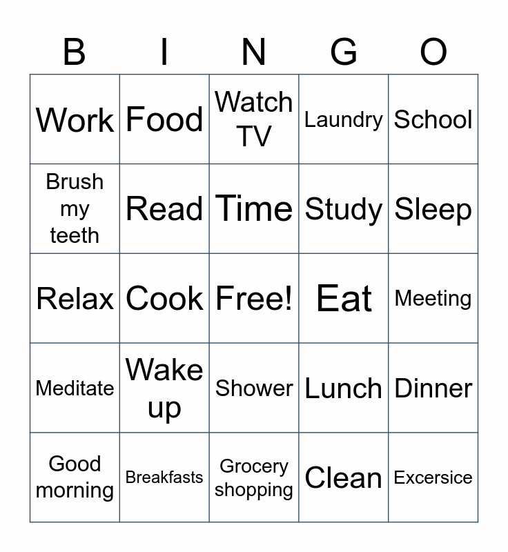 This bingo card has a free space and 24 words: Wake up, Breakfasts, Time, Good morning, School, Work, Brush my teeth, Food, Eat, Shower, Study, Relax, Lunch, Dinner, Read, Clean, Meeting, Watch TV, Sleep, Cook, Excersice, Meditate, Laundry and Grocery shopping.