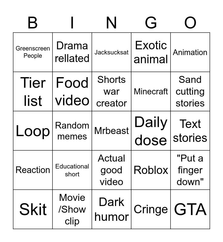 This bingo card has a free space and 24 words: Educational short, Movie /Show clip, Shorts war creator, Skit, Animation, Greenscreen People, Tier list, Drama rellated, Daily dose, Actual good video, Minecraft, Loop, Roblox, "Put a finger down", Food video, Cringe, Text stories, Jacksucksat, Sand cutting stories, Random memes, GTA, Reaction, Exotic animal and Dark humor.