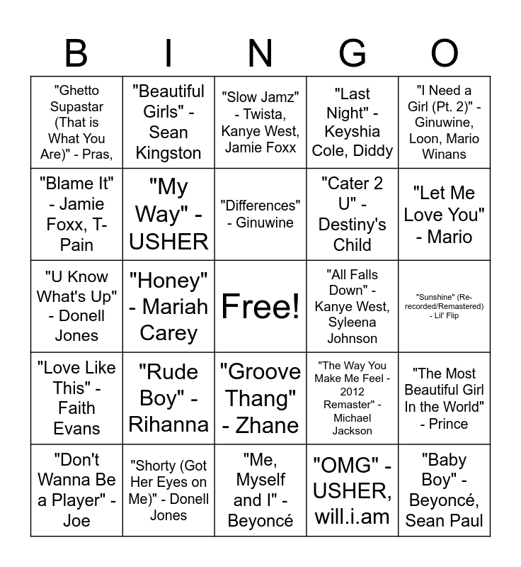 This bingo card has a free space and 40 words: "Can't Help but Wait" - Trey Songz, "U Know What's Up" - Donell Jones, "Cupid" - 112, "My Way" - USHER, "Shorty (Got Her Eyes on Me)" - Donell Jones, "Groove Thang" - Zhane, "Differences" - Ginuwine, "1 Thing" - Amerie, "I Need a Girl (Pt. 2)" - Ginuwine, Loon, Mario Winans, "Love Like This" - Faith Evans, "Honey" - Mariah Carey, "Last Night" - Keyshia Cole, Diddy, "Baby Boy" - Beyoncé, Sean Paul, "Sunshine" (Re-recorded/Remastered) - Lil' Flip, "All Falls Down" - Kanye West, Syleena Johnson, "Rude Boy" - Rihanna, "Unpretty" - TLC, "Ghetto Supastar (That is What You Are)" - Pras,, "Bartender" - T-Pain, Akon, "Slow Jamz" - Twista, Kanye West, Jamie Foxx, "The Most Beautiful Girl In the World" - Prince, "OMG" - USHER, will.i.am, "Cater 2 U" - Destiny's Child, "Blame It" - Jamie Foxx, T-Pain, "Knock You Down" - Keri Hilson, Kanye West, Ne-Yo, "Pretty Wings" - Maxwell, "All My Life" - K-Ci & JoJo, "How You Gonna Act Like That" - Tyrese, "When I See U" - Fantasia, "Foolish" - Ashanti, "Candy Rain" - Soul For Real, "Don't Wanna Be a Player" - Joe, "The Way You Move" - Outkast, Sleepy Brown, "The Way You Make Me Feel - 2012 Remaster" - Michael Jackson, "Let Me Love You" - Mario, "Me, Myself and I" - Beyoncé, "Make Me Better" - Fabolous, Ne-Yo, "Fallin'" - Alicia Keys, "Beautiful Girls" - Sean Kingston and "Sweet Dreams" - Beyoncé.