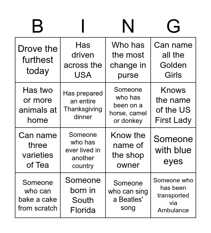 This bingo card has 16 words: Someone born in South Florida, Someone with blue eyes, Who has the most change in purse, Drove the furthest today, Can name three varieties of Tea, Has driven across the USA, Know the name of the shop owner, Someone who can sing a Beatles' song, Has two or more animals at home, Has prepared an entire Thanksgiving dinner, Someone who can bake a cake from scratch, Can name all the Golden Girls, Someone who has ever lived in another country, Knows the name of the US First Lady, Someone who has been on a horse, camel or donkey and Someone who has been transported via Ambulance.