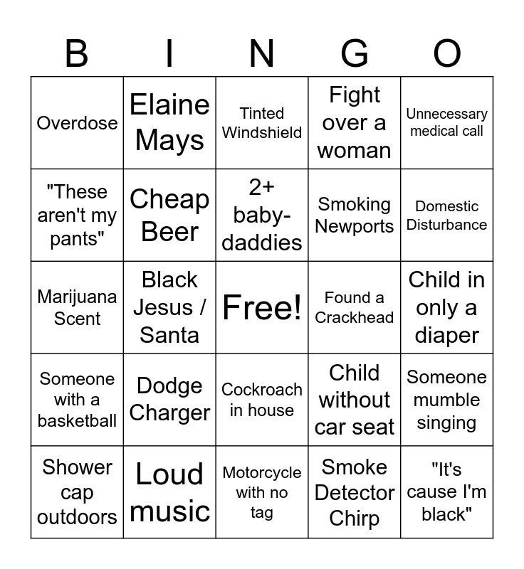 This bingo card has a free space and 24 words: Dodge Charger, Loud music, 2+ baby-daddies, Shower cap outdoors, Unnecessary medical call, Overdose, "These aren't my pants", Elaine Mays, Found a Crackhead, Cockroach in house, Smoking Newports, Marijuana Scent, Child without car seat, Someone mumble singing, Cheap Beer, Smoke Detector Chirp, Child in only a diaper, Tinted Windshield, Domestic Disturbance, Black Jesus / Santa, "It's cause I'm black", Someone with a basketball, Fight over a woman and Motorcycle with no tag.