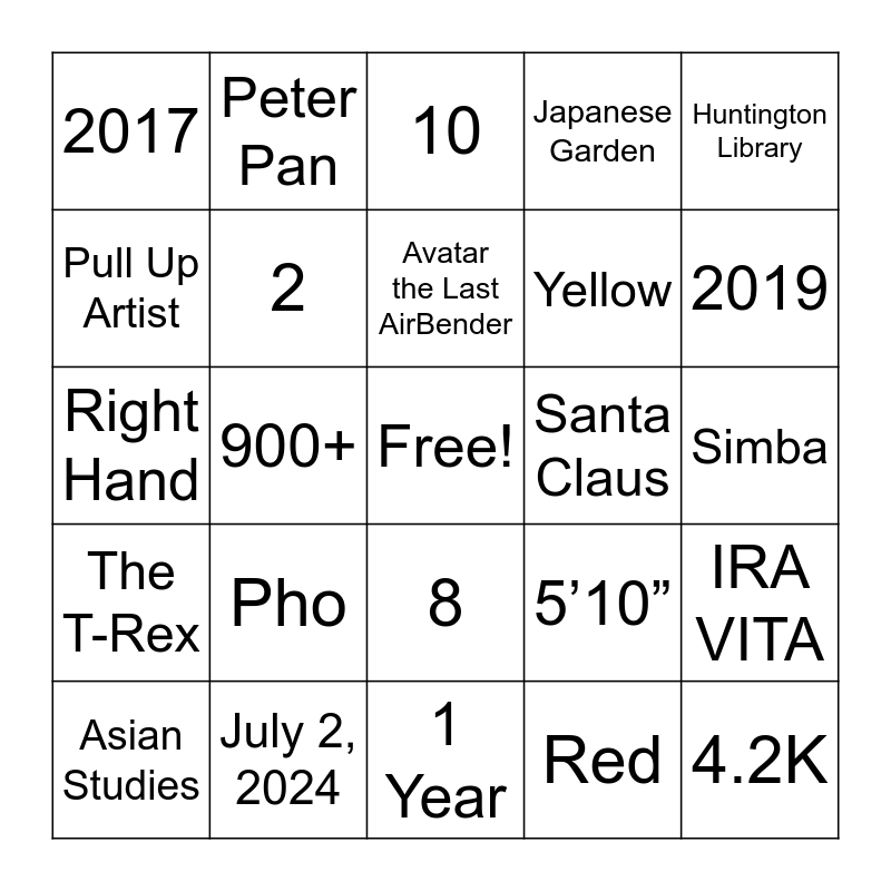 This bingo card has a free space and 26 words: 8, Red, Avatar the Last AirBender, July 2, 2024, Huntington Library, 2017, Pull Up Artist, Peter Pan, Simba, 5’10”, Yellow, Right Hand, IRA VITA, Asian Studies, 900+, Leo, Japanese Garden, The T-Rex, 10, 4.2K, 2019, 1 Year, Santa Claus, Pho, 2 and 3.