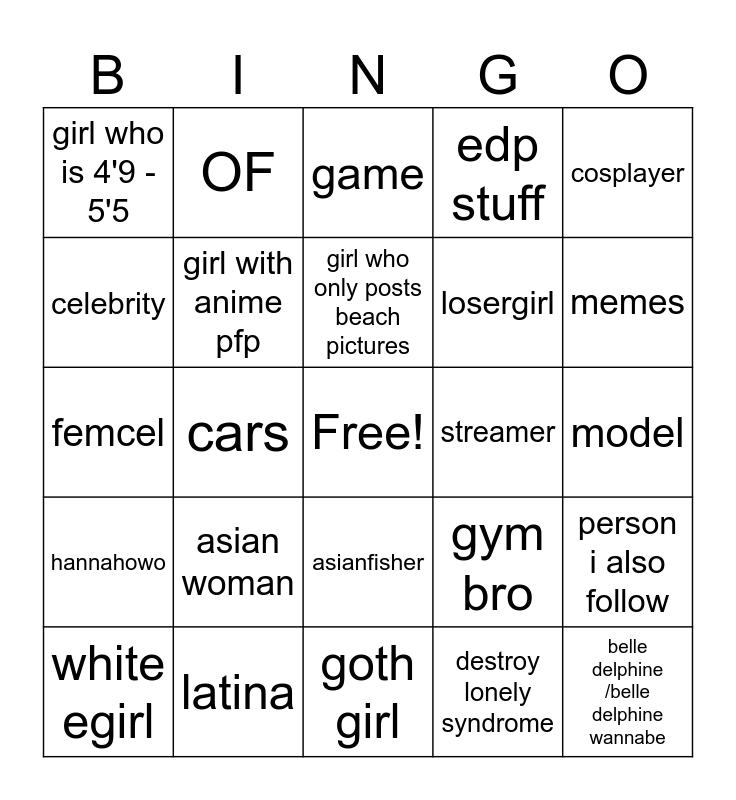 This bingo card has a free space and 24 words: asian woman, latina, girl who only posts beach pictures, white egirl, cosplayer, girl who is 4'9 - 5'5, celebrity, OF, streamer, asianfisher, losergirl, femcel, gym bro, person i also follow, girl with anime pfp, destroy lonely syndrome, model, game, memes, cars, belle delphine /belle delphine wannabe, hannahowo, edp stuff and goth girl.