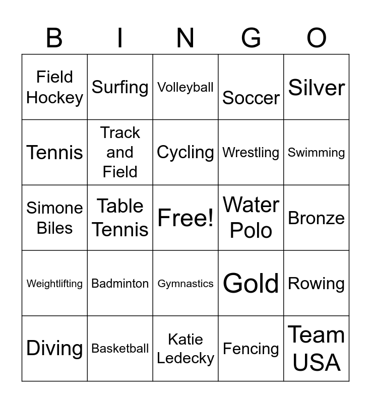 This bingo card has a free space and 24 words: Badminton, Basketball, Cycling, Diving, Silver, Field Hockey, Tennis, Surfing, Water Polo, Gymnastics, Wrestling, Simone Biles, Gold, Rowing, Track and Field, Fencing, Bronze, Volleyball, Swimming, Table Tennis, Team USA, Weightlifting, Soccer and Katie Ledecky.