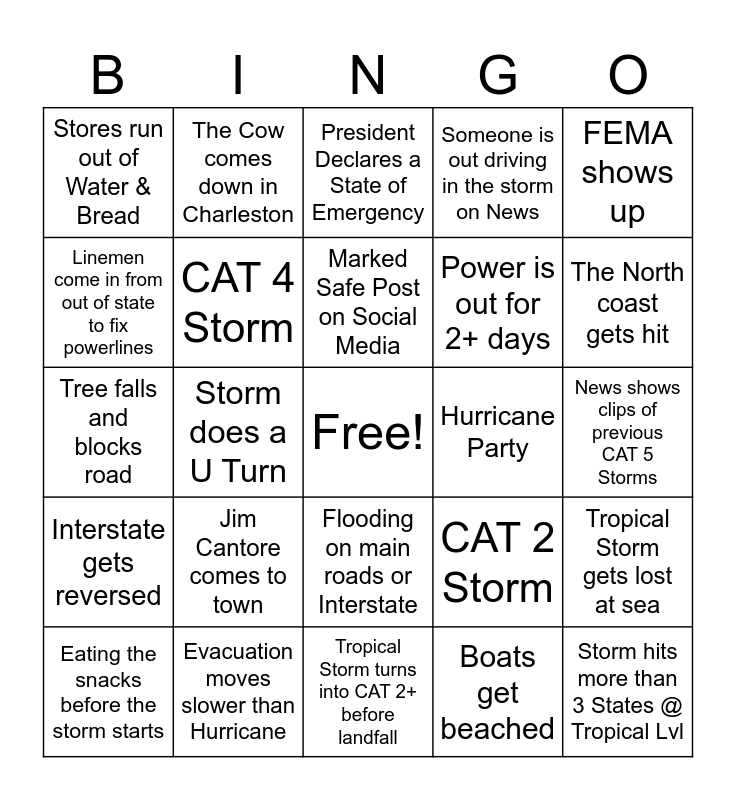 This bingo card has a free space and 24 words: Jim Cantore comes to town, Evacuation moves slower than Hurricane, Marked Safe Post on Social Media, Eating the snacks before the storm starts, FEMA shows up, Stores run out of Water & Bread, Linemen come in from out of state to fix powerlines, The Cow comes down in Charleston, Hurricane Party, Flooding on main roads or Interstate, Power is out for 2+ days, Tree falls and blocks road, CAT 2 Storm, Tropical Storm gets lost at sea, CAT 4 Storm, Boats get beached, News shows clips of previous CAT 5 Storms, President Declares a State of Emergency, The North coast gets hit, Storm does a U Turn, Storm hits more than 3 States @ Tropical Lvl, Interstate gets reversed, Someone is out driving in the storm on News and Tropical Storm turns into CAT 2+ before landfall.