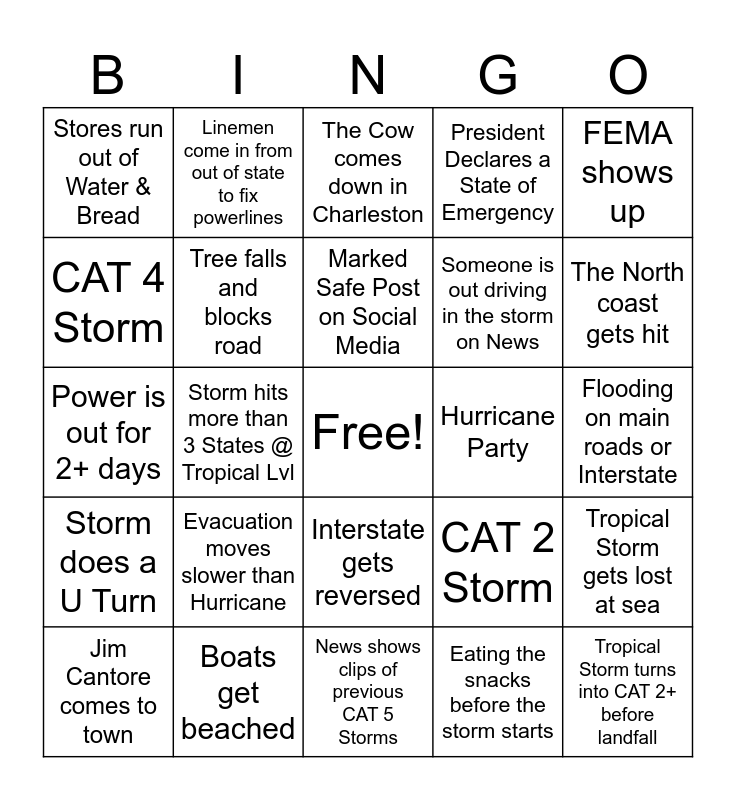 This bingo card has a free space and 24 words: Jim Cantore comes to town, Evacuation moves slower than Hurricane, Marked Safe Post on Social Media, Eating the snacks before the storm starts, FEMA shows up, Stores run out of Water & Bread, Linemen come in from out of state to fix powerlines, The Cow comes down in Charleston, Hurricane Party, Flooding on main roads or Interstate, Power is out for 2+ days, Tree falls and blocks road, CAT 2 Storm, Tropical Storm gets lost at sea, CAT 4 Storm, Boats get beached, News shows clips of previous CAT 5 Storms, President Declares a State of Emergency, The North coast gets hit, Storm does a U Turn, Storm hits more than 3 States @ Tropical Lvl, Interstate gets reversed, Someone is out driving in the storm on News and Tropical Storm turns into CAT 2+ before landfall.