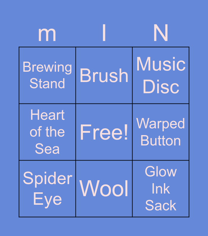 This bingo card has a free space and 8 words: Warped Button, Music Disc, Brush, Spider Eye, Brewing Stand, Glow Ink Sack, Heart of the Sea and Wool.