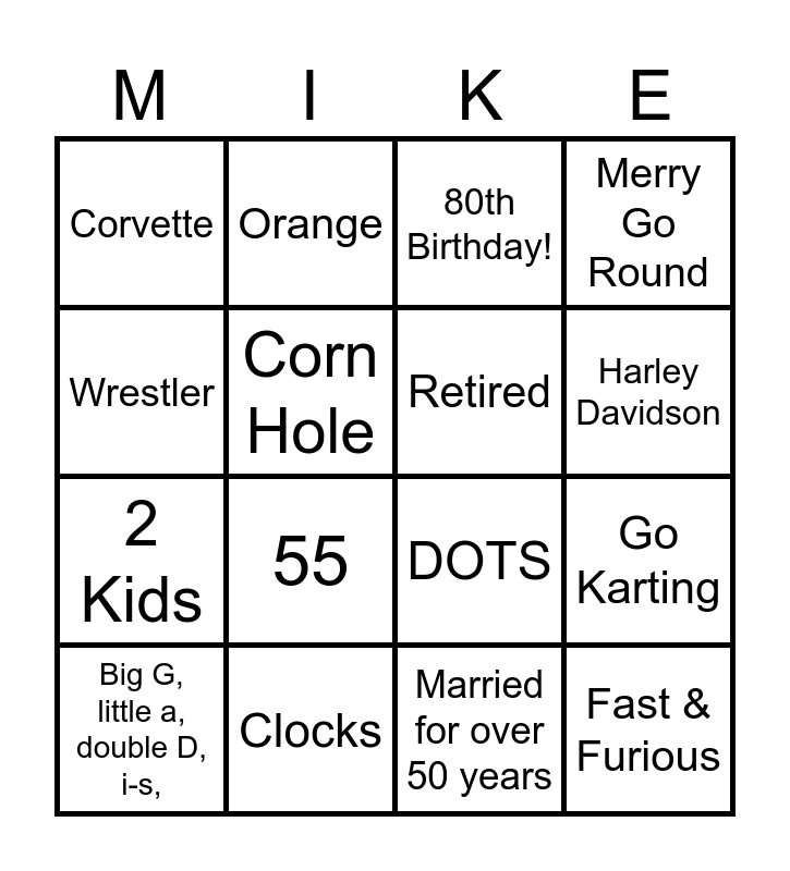 This bingo card has 21 words: Clocks, Diet Coke, Orange, Yard Sale, Married for over 50 years, Retired, Corvette, 80th Birthday!, DOTS, Harley Davidson, 2 Kids, Merry Go Round, Fast & Furious, Ice Cream, Corn Hole, Red, Big G, little a, double D, i-s,, 55, Wrestler, Go Karting and Jokester.