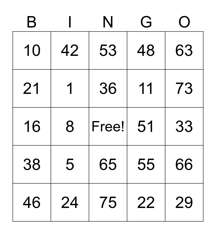 This bingo card has a free space and 24 words: 5, 24, 36, 46, 63, 10, 21, 42, 51, 65, 11, 16, 55, 66, 1, 22, 33, 53, 73, 8, 29, 38, 48 and 75.