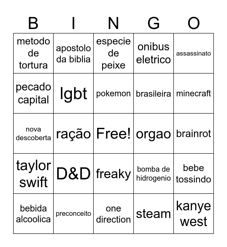 This bingo card has a free space and 24 words: D&D, preconceito, pokemon, bebida alcoolica, assassinato, metodo de tortura, pecado capital, apostolo da biblia, orgao, freaky, brasileira, nova descoberta, bomba de hidrogenio, bebe tossindo, lgbt, steam, brainrot, especie de peixe, minecraft, ração, kanye west, taylor swift, onibus eletrico and one direction.