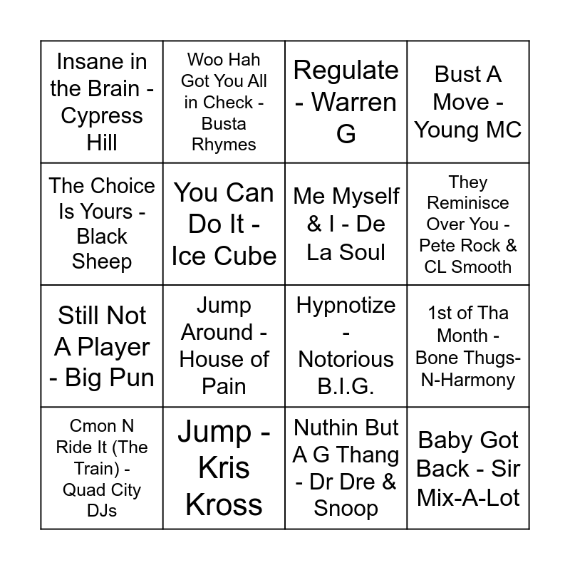 This bingo card has 25 words: Wild Thing - Tone-Loc, The Humpty Dance - Digital Underground, They Reminisce Over You - Pete Rock & CL Smooth, Gangstas Paradise - Coolio, The Choice Is Yours - Black Sheep, Insane in the Brain - Cypress Hill, You Can Do It - Ice Cube, Woo Hah Got You All in Check - Busta Rhymes, Jump - Kris Kross, Around The Girl - LL Cool J, Still Not A Player - Big Pun, Hypnotize - Notorious B.I.G., Hip Hop Hooray - Naughty by Nature, My Name Is - Eminem, Me Myself & I - De La Soul, It Was A Good Day - Ice Cube, Nuthin But A G Thang - Dr Dre & Snoop, Regulate - Warren G, Jump Around - House of Pain, 1st of Tha Month - Bone Thugs-N-Harmony, Cmon N Ride It (The Train) - Quad City DJs, Feel so Good - Mase, Baby Got Back - Sir Mix-A-Lot, Bust A Move - Young MC and Forgot About Dre - Dr Dre, Eminem.