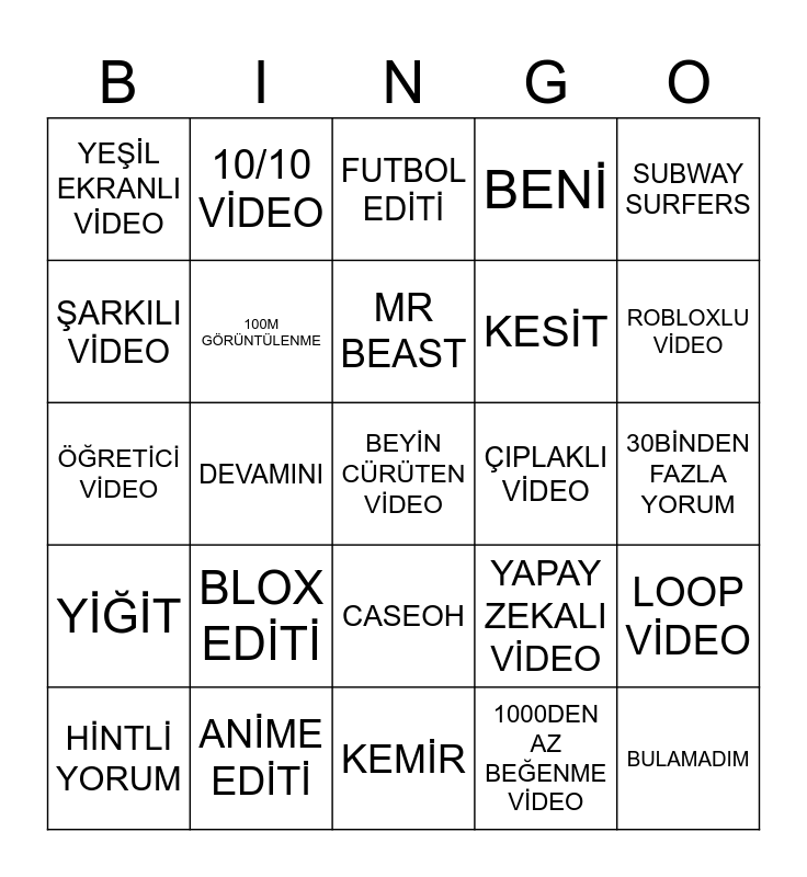 This bingo card has a free space and 24 words: BLOX EDİTİ, ANİME EDİTİ, MR BEAST, HİNTLİ YORUM, SUBWAY SURFERS, YEŞİL EKRANLI VİDEO, ŞARKILI VİDEO, 10/10 VİDEO, ÇIPLAKLI VİDEO, CASEOH, KESİT, ÖĞRETİCİ VİDEO, YAPAY ZEKALI VİDEO, LOOP VİDEO, 100M GÖRÜNTÜLENME, 1000DEN AZ BEĞENME VİDEO, 30BİNDEN FAZLA YORUM, FUTBOL EDİTİ, ROBLOXLU VİDEO, DEVAMINI, BULAMADIM, YİĞİT, BENİ and KEMİR.