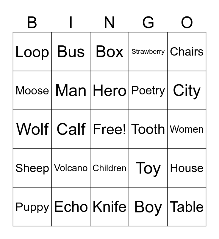 This bingo card has a free space and 104 words: Dogs, Pens, Chairs, Boxes, Taxes, Buses, Wolves, Calves, Knives, Mangoes, Potatoes, Mosquitos, Volcanoes, Dog, Pen, Chair, Box, Tax, Bus, Wolf, Calf, Knife, Mango, Potato, Mosquito, Volcano, City, Strawberry, Puppy, Ray, Toy, Boy, Cactus, Man, Child, Tooth, Mouse, Woman, Hero, Echo, Fish, Sheep, Deer, Moose, House, Loop, Sister, Table, Poetry, Cities, Strawberries, Puppies, Rays, Toys, Boys, Cacti, Men, Teeth, Mice, Children, Women, Heroes, Dog, Pen, Chair, Box, Tax, Bus, Wolf, Calf, Knife, Mango, Potato, Mosquito, Volcano, City, Strawberry, Puppy, Ray, Toy, Boy, Cactus, Man, Child, Tooth, Mouse, Woman, Hero, Echo, Fish, Sheep, Deer, Moose, House, Loop, Sister, Table, Poetry, Echoes, Houses, Loops, Sisters, Tables and Poetries.
