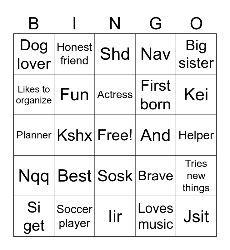 This bingo card has a free space and 24 words: Best, Soccer player, Actress, Si get, Big sister, Dog lover, Likes to organize, Honest friend, And, Sosk, First born, Planner, Brave, Tries new things, Fun, Loves music, Helper, Shd, Kei, Kshx, Jsit, Nqq, Nav and Iir.
