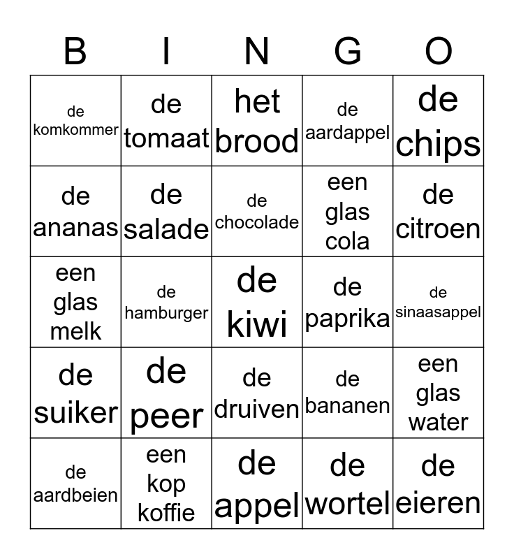 This bingo card has 25 words: de peer, de appel, de chocolade, de aardbeien, de chips, de komkommer, de ananas, de tomaat, de paprika, de druiven, een glas cola, een glas melk, de bananen, een glas water, de salade, de eieren, de sinaasappel, het brood, de citroen, de hamburger, de kiwi, een kop koffie, de suiker, de aardappel and de wortel.