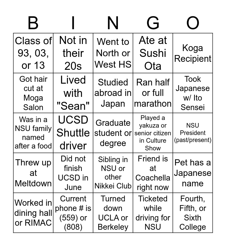 This bingo card has 25 words: Did not finish UCSD in June, Turned down UCLA or Berkeley, Studied abroad in Japan, Worked in dining hall or RIMAC, Koga Recipient, Class of 93, 03, or 13, Got hair cut at Moga Salon, Not in their 20s, Played a yakuza or senior citizen in Culture Show, Sibling in NSU or other Nikkei Club, Ran half or full marathon, Was in a NSU family named after a food, Friend is at Coachella right now, Pet has a Japanese name, Lived with "Sean", Fourth, Fifth, or Sixth College, NSU President (past/present), Went to North or West HS, Took Japanese w/ Ito Sensei, UCSD Shuttle driver, Graduate student or degree, Current phone # is (559) or (808), Threw up at Meltdown, Ate at Sushi Ota and Ticketed while driving for NSU.