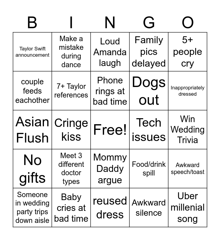 This bingo card has a free space and 24 words: Meet 3 different doctor types, Baby cries at bad time, Phone rings at bad time, Someone in wedding party trips down aisle, 5+ people cry, Taylor Swift announcement, couple feeds eachother, Make a mistake during dance, Tech issues, Mommy Daddy argue, Dogs out, Asian Flush, Food/drink spill, Awkward speech/toast, 7+ Taylor references, Awkward silence, Win Wedding Trivia, Loud Amanda laugh, Inappropriately dressed, Cringe kiss, Uber millenial song, No gifts, Family pics delayed and reused dress.