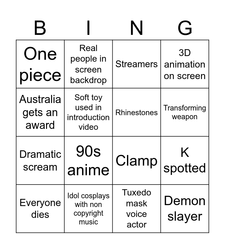 This bingo card has 43 words: Free!, Everyone dies, Intentional breaking of things, Unintentional breaking of things, Quick change, 1 person hidden for exactly 10 seconds, Streamers, Clamp, Australia gets an award, Goldwork, 3D animation on screen, Idol cosplays with non copyright music, Marriage proposal, Homophobic/sexist jokes in 2024, Ad for NFTs, Character name pronounced wrong, Madoka, Clamp, Magic trick, 90s anime, Real people in screen backdrop, Unlicensed music, Wig flew, One piece, Legend of Zelda, Tuxedo mask voice actor, Sentai/tokusatsu, Fighting skit needed more rehearsing, Skit doesn’t make sense if you haven’t seen the show, Demon slayer, Fighting game, Ghibli, Fake blood, K spotted, Team hot chips spotted, Both feet of competitor leave the stage, Strobe lights, Transforming weapon, Soft toy used in introduction video, Dramatic scream, Mind control, Rhinestones and The same characters in 2 different skits.