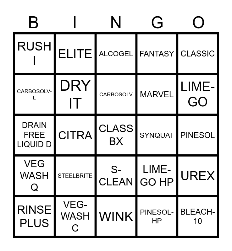 This bingo card has 76 words: Free!, A-CLEAN, ALCOGEL, ALCOSAN, ALKABLUE, ALKACLEAN, ALKASOLV, APEX, ASSAULT, BLEACH, BLEACH-10, CARBO XL, CARBOSOLV, CARBOSOLV-L, CARESS, CITRA, CLASS B, CLASS BX, CLASS, CLASSIC, CLEAN PLUS, DRAIN FREE LIQUID D, DRY IT, ELITE, FANTASY, FEROUST, GAIA GENIE, GAIA SPRAY, GENIE, GENIE-Y (A), GENIE-Y, HARMONY, JEL-PINE, LIME-GO HP, LIME-GO, MARVEL, NUTRA, OREAS, PINESOL, PINESOL-HP, QACIDAL, QUASER, REFRESH LIME, REFRESH V, RENEW, RID, RINSE PLUS, RUSH I, SANI-CLEAN, SCALE OFF, S-CLEAN HP, S-CLEAN, SILKY, SNAP, SOSOFT - ROSE, SOUR-L, SPOTLESS, SPRING, S-RINSE HP, S-RINSE, STEELBRITE, STERIWASH, STERI-WASH SC, SUMMER, SUPPLE, SYNQUAT HPD, SYNQUAT, TERPINE, TEXCLEAN, TRACT-OUT, UREX, VEG WASH Q, VEG-WASH C, WASH-IT, WINK and X-TRA.