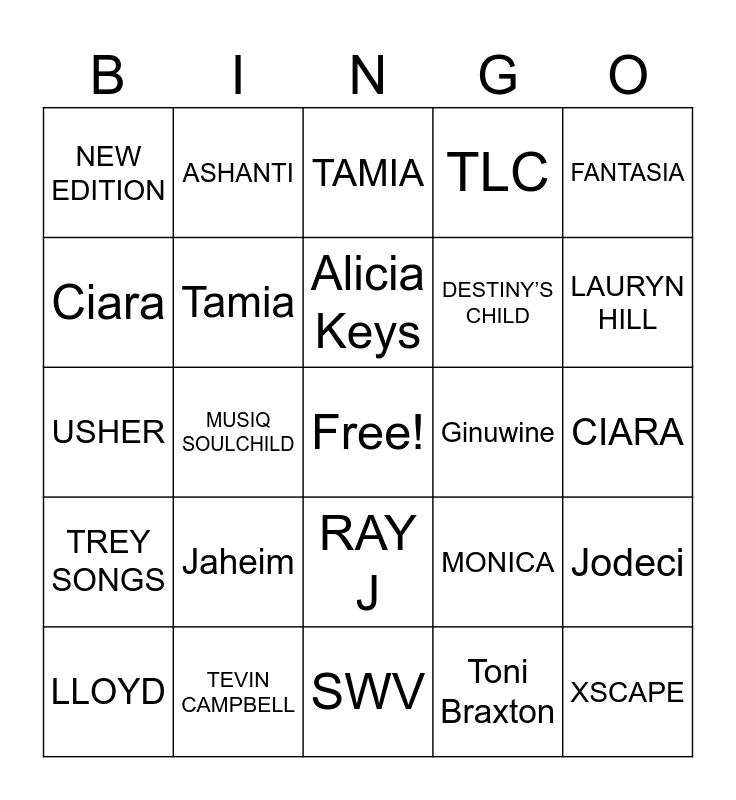 This bingo card has a free space and 48 words: MARIAH CAREY, XSCAPE, Dru Hill, SWV, Jaheim, Mary J. Blige, ASHANTI, MAXWELL NE-YO, Ciara, Keyshia Cole, Tamia, TLC, Jodeci, MONICA, BRANDY, Usher, Alicia Keys, Ginuwine, R.Kelly, FANTASIA, MUSIQ SOULCHILD, Toni Braxton, NEW EDITION, DESTINY’S CHILD, NICKI MINAJ, LAURYN HILL, LLOYD, NEYO, RAY J, TREY SONGS, VERSE SIMMONS, JEEZY, LIL WAYNE, BEYONCE, TEVIN CAMPBELL, JAHIEM, CHRIS BROWN, CIARA, TUPAC, THE NOTORIOUS BIG, JODECI, PLEASURE P, TAMIA, RHIANNA, USHER, MARIO, YOUNG DOLPH and KEITH SWEAT.