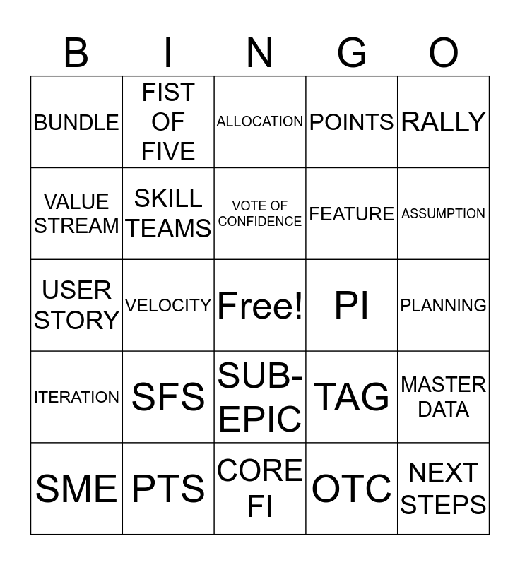 This bingo card has a free space and 24 words: SFS, PTS, VOTE OF CONFIDENCE, SME, RALLY, BUNDLE, VALUE STREAM, FIST OF FIVE, PI, SUB-EPIC, FEATURE, USER STORY, TAG, MASTER DATA, SKILL TEAMS, OTC, PLANNING, ALLOCATION, ASSUMPTION, VELOCITY, NEXT STEPS, ITERATION, POINTS and CORE FI.