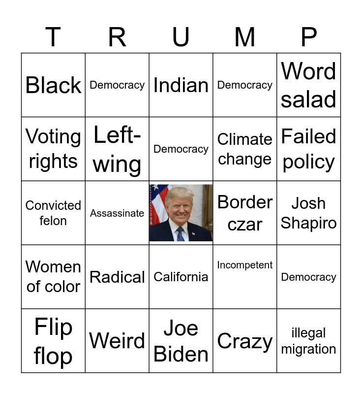 This bingo card has a free space and 29 words: Flip flop, Fake news, Assassinate, God, Black, Indian, Left-wing, Radical, Border czar, Weird, Josh Shapiro, illegal migration, Joe Biden, Crazy, Failed policy, J.D. Vance, California, Women of color, Word salad, Convicted felon, Incompetent, Taxes, Climate change, Voting rights, Democracy, Democracy, Democracy, Democracy and Democracy.