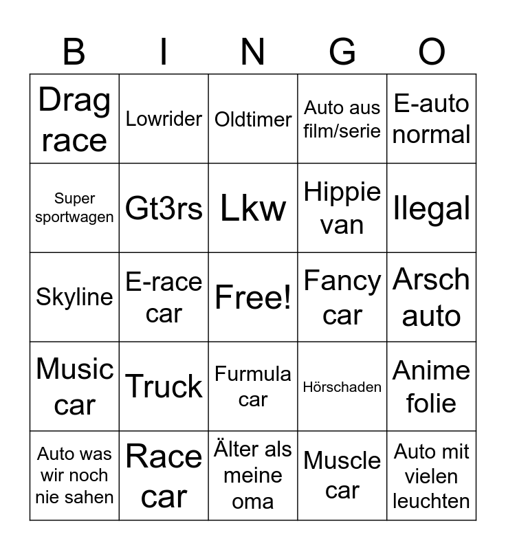 This bingo card has a free space and 24 words: Auto was wir noch nie sahen, Truck, Lkw, Muscle car, E-auto normal, Drag race, Lowrider, Oldtimer, Fancy car, Arsch auto, Skyline, Gt3rs, Hörschaden, Anime folie, Super sportwagen, Race car, Älter als meine oma, Auto aus film/serie, Ilegal, Music car, E-race car, Furmula car, Hippie van and Auto mit vielen leuchten.