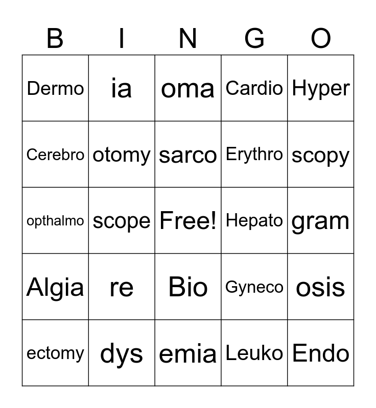 This bingo card has a free space and 54 words: Adeno, Algia, Arthro, Auto, Bio, Carcino, Cardio, Cephalo, Cerebro, Cysto, Dermo, dia, dys, ectomy, electro, emia, Endo, Erythro, Gastro, gram, Gyneco, Hemato, Hepato, Hyper, Hypo, ia, Isch, itis, Laparo, Leuko, Nephro, Neuro, ologist, ology, oma, onco, opthalmo, osis, osteo, otomy, patho, peri, pro, psycho, re, reno, retro, rhino, sarco, scope, scopy, sub, thrombo and trans.
