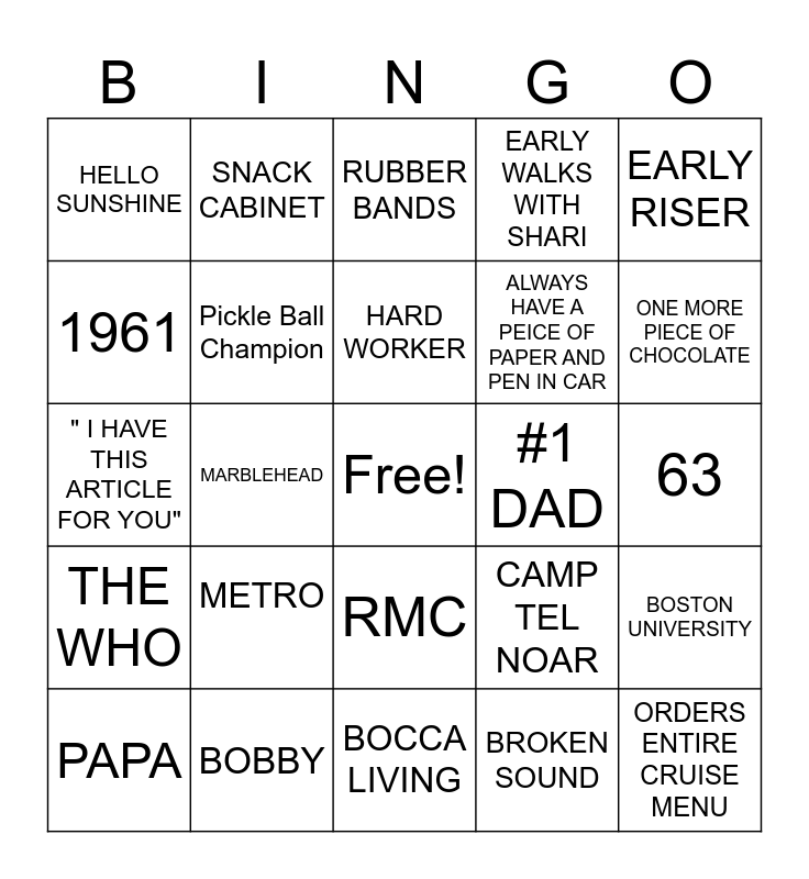 This bingo card has a free space and 24 words: METRO, BOBBY, HARD WORKER, PAPA, EARLY RISER, HELLO SUNSHINE, 1961, SNACK CABINET, #1 DAD, RMC, ALWAYS HAVE A PEICE OF PAPER AND PEN IN CAR, " I HAVE THIS ARTICLE FOR YOU", CAMP TEL NOAR, BOSTON UNIVERSITY, Pickle Ball Champion, BROKEN SOUND, 63, RUBBER BANDS, ONE MORE PIECE OF CHOCOLATE, MARBLEHEAD, ORDERS ENTIRE CRUISE MENU, THE WHO, EARLY WALKS WITH SHARI and BOCCA LIVING.