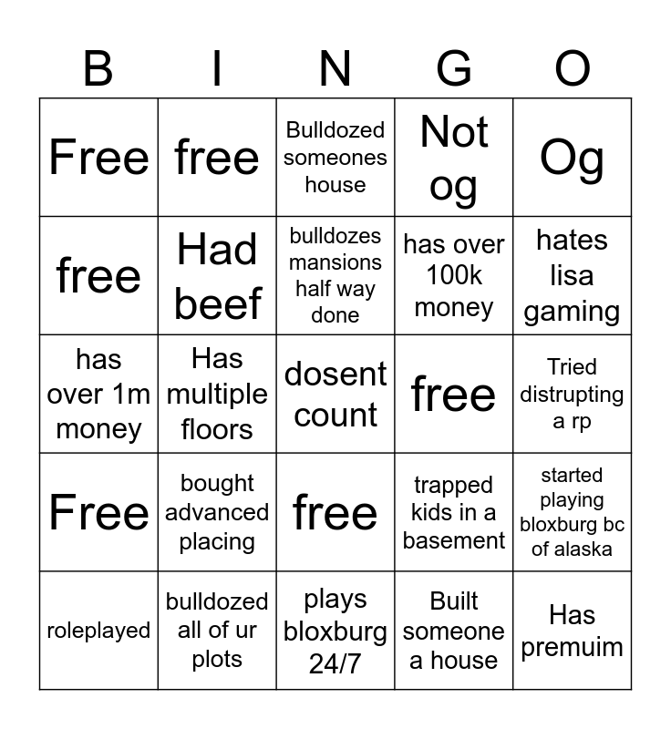 This bingo card has a free space and 24 words: bought advanced placing, bulldozed all of ur plots, bulldozes mansions half way done, roleplayed, Og, Free, free, free, free, free, has over 100k money, has over 1m money, trapped kids in a basement, started playing bloxburg bc of alaska, Had beef, Built someone a house, Tried distrupting a rp, Bulldozed someones house, hates lisa gaming, Has multiple floors, Has premuim, Free, Not og and plays bloxburg 24/7.