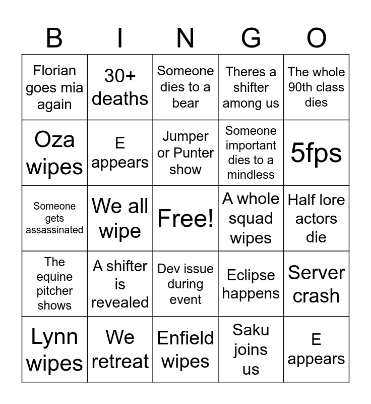 This bingo card has a free space and 24 words: A shifter is revealed, We retreat, Jumper or Punter show, Lynn wipes, The whole 90th class dies, Florian goes mia again, Oza wipes, 30+ deaths, A whole squad wipes, Dev issue during event, Someone important dies to a mindless, Someone gets assassinated, Eclipse happens, Server crash, E appears, Saku joins us, Half lore actors die, Someone dies to a bear, 5fps, We all wipe, E appears, The equine pitcher shows, Theres a shifter among us and Enfield wipes.