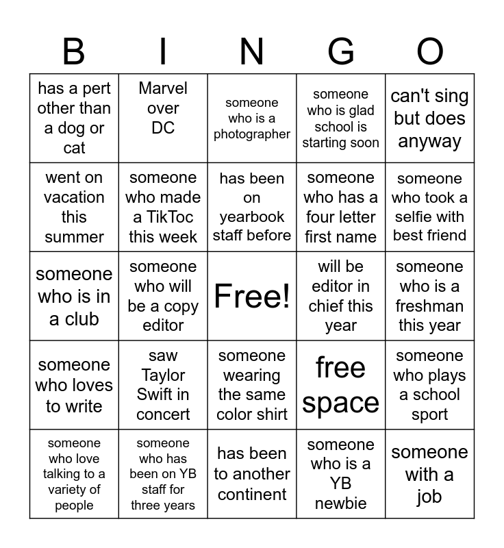 This bingo card has a free space and 25 words: saw Taylor Swift in concert, has been to another continent, has been on yearbook staff before, someone who love talking to a variety of people, can't sing but does anyway, has a pert other than a dog or cat, went on vacation this summer, Marvel over DC, will be editor in chief this year, someone wearing the same color shirt, someone who has a four letter first name, someone who is in a club, free space, someone who plays a school sport, someone who made a TikToc this week, someone who can play an instrument, someone who is a freshman this year, someone who is a photographer, someone who took a selfie with best friend, someone who will be a copy editor, someone with a job, someone who has been on YB staff for three years, someone who loves to write, someone who is glad school is starting soon and someone who is a YB newbie.