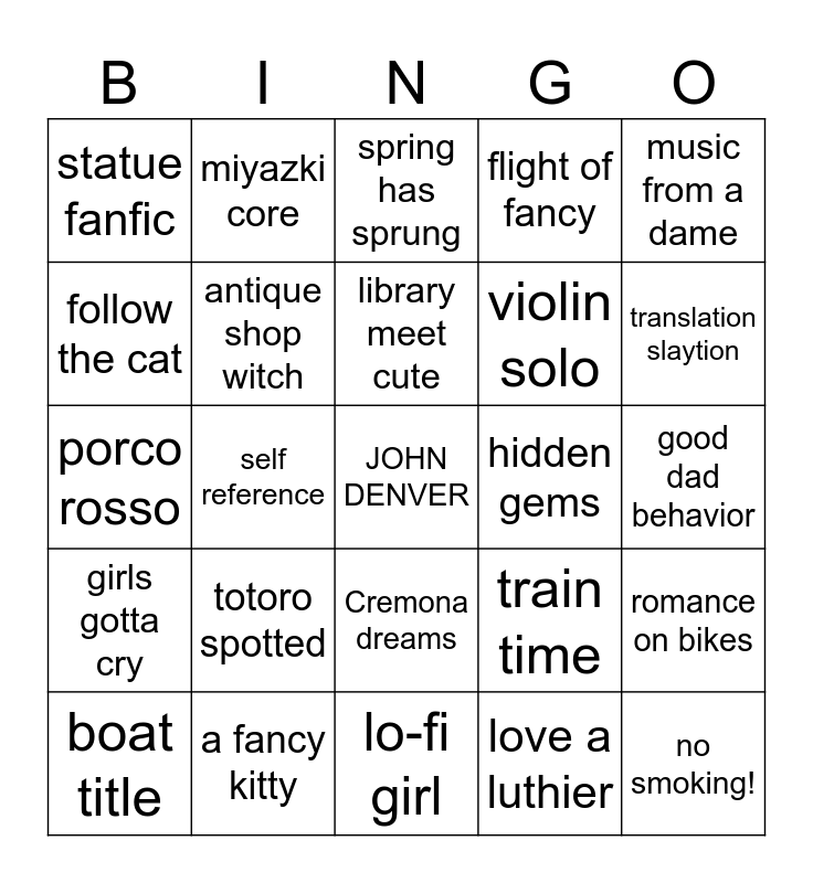 This bingo card has a free space and 24 words: totoro spotted, a fancy kitty, library meet cute, boat title, music from a dame, statue fanfic, follow the cat, miyazki core, hidden gems, Cremona dreams, violin solo, porco rosso, train time, romance on bikes, antique shop witch, love a luthier, good dad behavior, spring has sprung, translation slaytion, self reference, no smoking!, girls gotta cry, flight of fancy and lo-fi girl.