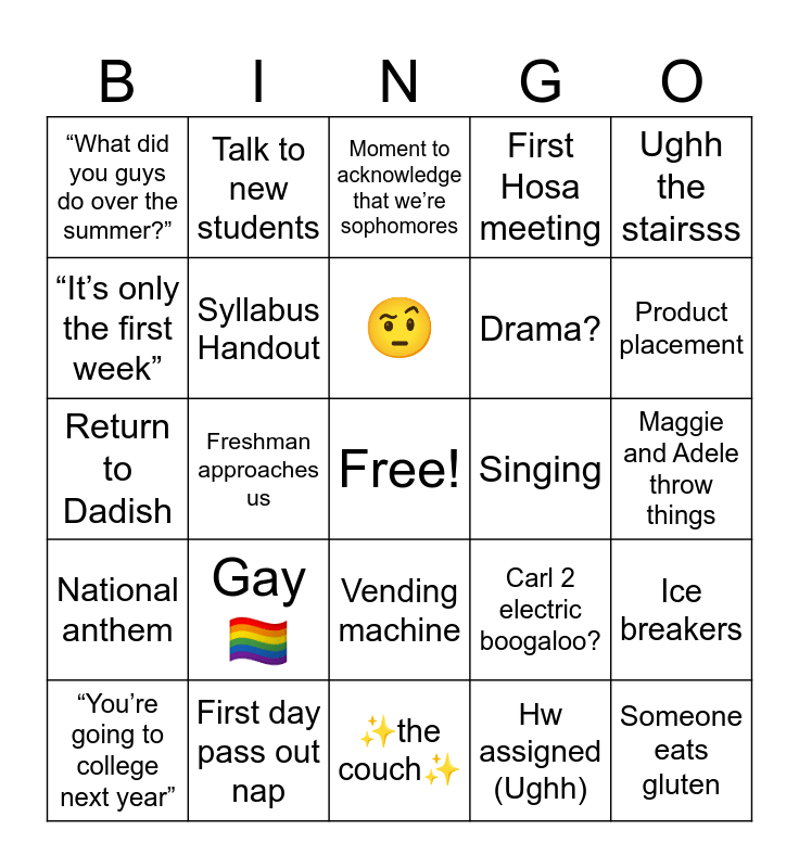 This bingo card has a free space and 28 words: Ice breakers, Expectations, Drama?, Hw assigned (Ughh), “It’s only the first week”, Moment to acknowledge that we’re sophomores, Talk to new students, National anthem, Singing, “You’re going to college next year”, Return to Dadish, First Hosa meeting, First day pass out nap, ✨the couch✨, Product placement, Crushes? Romance?, Gay 🏳️🌈, Syllabus Handout, 🤨, Vending machine, “What did you guys do over the summer?”, Puns, Someone eats gluten, Freshman approaches us, Maggie and Adele throw things, Carl 2 electric boogaloo?, Ughh the stairsss and Someone says Talia’s name wrong.