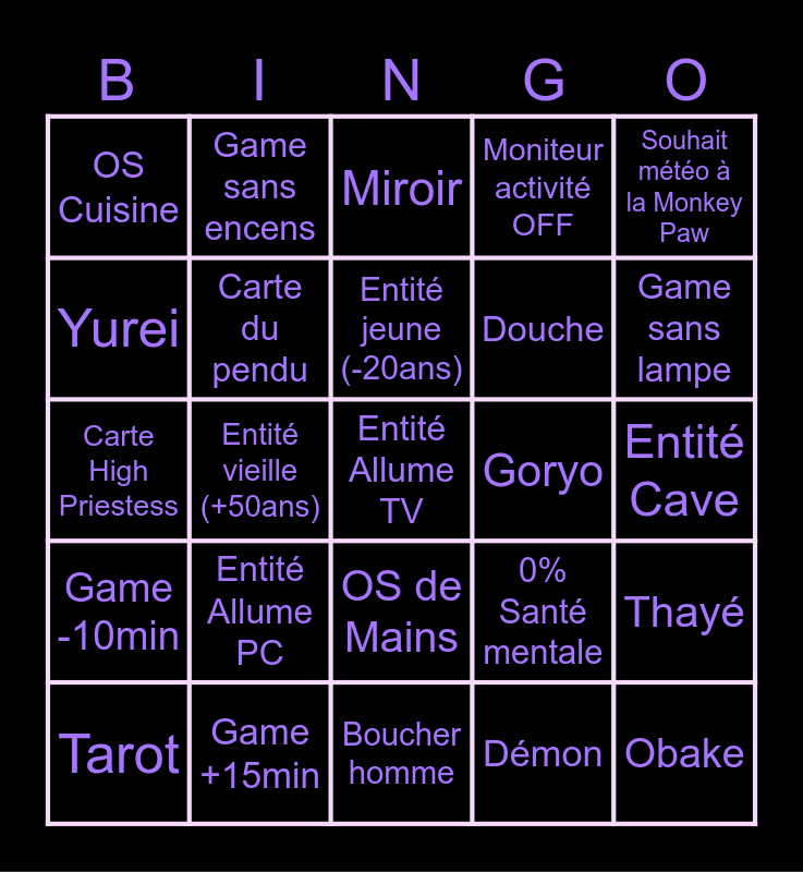 This bingo card has 115 words: 6 Tanglewood drive, 42 Edgefield road, 10 Ridgeview court, 13 Willow Street, Campement, Moniteur de Santé mental OFF, Moniteur activité OFF, Cri du Deogen, Cri de la Banshee, Malédiction du Moroï, Température glaciale, Santé mentale >25%, Boîte à musique, Colonne vertébrale, Cage thoracique, Crâne, OS de Mains, OS de Pieds, Ouija, Cercle d'invocation, Tarot, Miroir, Monkey Paw, Poupée Vaudou, Game -5min, Game -10min, Game +15min, Game sans livre, Game parfait, Photo 3* entité, Game sans lampe, Entité jeune (-20ans), Entité vieille (+50ans), Photo interrupteur, Empreinte fenêtre, Empreinte interrupteur, Empreinte obake, Esprit, Spectre, Fantôme, Poltergeist, Banshee, Djinn, Cauchemar, Revenant, Ombre, Démon, Yurei, Oni, Yokai, Hantu, Goryo, Myling, Onryo, Les Jumeaux, Raiju, Obake, Le Mimic, Moroi, Deogen, Thayé, Difficulté aléatoire, Game sans preuve, Game preuve unique, Game double preuve, Température entre -3° et -5°, Game sans pilule, Carte du pendu, Carte High Priestess, Entité Garage, Entité Cave, Entité coupe le courant, Entité Salle de Bain, Entité Allume lumière, Entité Eteint lumière, Entité Allume TV, Entité Allume PC, OS Cuisine, OS Garage, OS Cave, Entité coupe 2x le courant, Game sans encens, 2x une même entité, 0% Santé mentale, Douche, Eau Sale, Téléphone sonne, Téléphone Vibre, Son mic. parabolique, Ghost tout nu, Ghost rampant, Ghost plié, Pièce de l'entité à la ouija, Alarme voiture, Souhait météo à la Monkey Paw, Photo OS, Position de l'OS à la ouija, Trouver + photo OS, 5 Sons au mic. parabolique, "Old" à la spirit, "Behind" à la spirit, Changement de salle préférée, Bouge mastic, Jette le livre, Être la cible de la Banshee, Photo du DOTS, Cassure courbe d'activité, Sadako, Boucher homme, Boucher Femme, Enfant, Chasse maudite, Utiliser 3s le miroir, Allumer 3 bougie du cercle and Chasse sans objet dans l'inventaire.