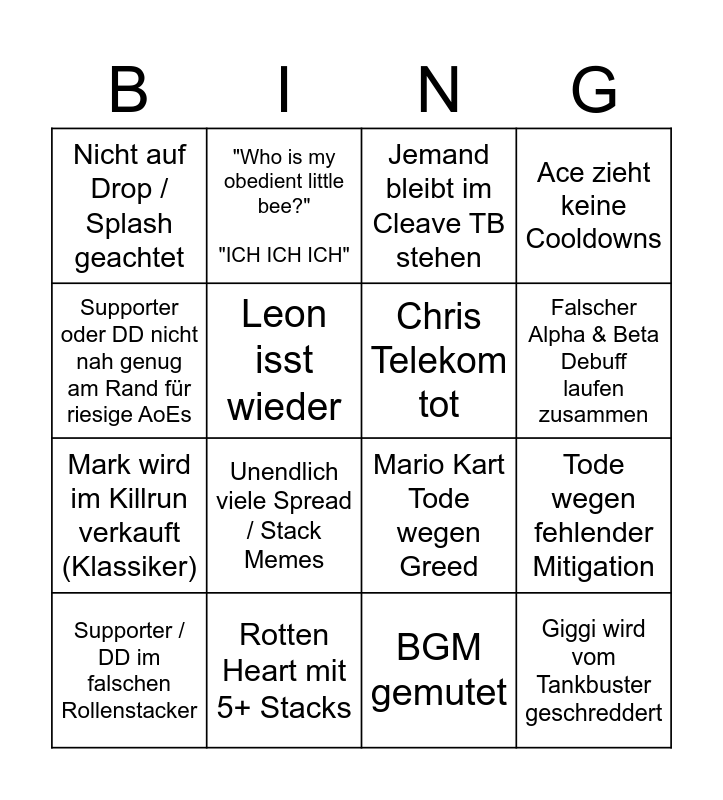 This bingo card has 16 words: Rotten Heart mit 5+ Stacks, Tode wegen fehlender Mitigation, Jemand bleibt im Cleave TB stehen, Nicht auf Drop / Splash geachtet, Mark wird im Killrun verkauft (Klassiker), "Who is my obedient little bee?" "ICH ICH ICH", Mario Kart Tode wegen Greed, BGM gemutet, Supporter oder DD nicht nah genug am Rand für riesige AoEs, Leon isst wieder, Supporter / DD im falschen Rollenstacker, Ace zieht keine Cooldowns, Unendlich viele Spread / Stack Memes, Falscher Alpha & Beta Debuff laufen zusammen, Chris Telekom tot and Giggi wird vom Tankbuster geschreddert.