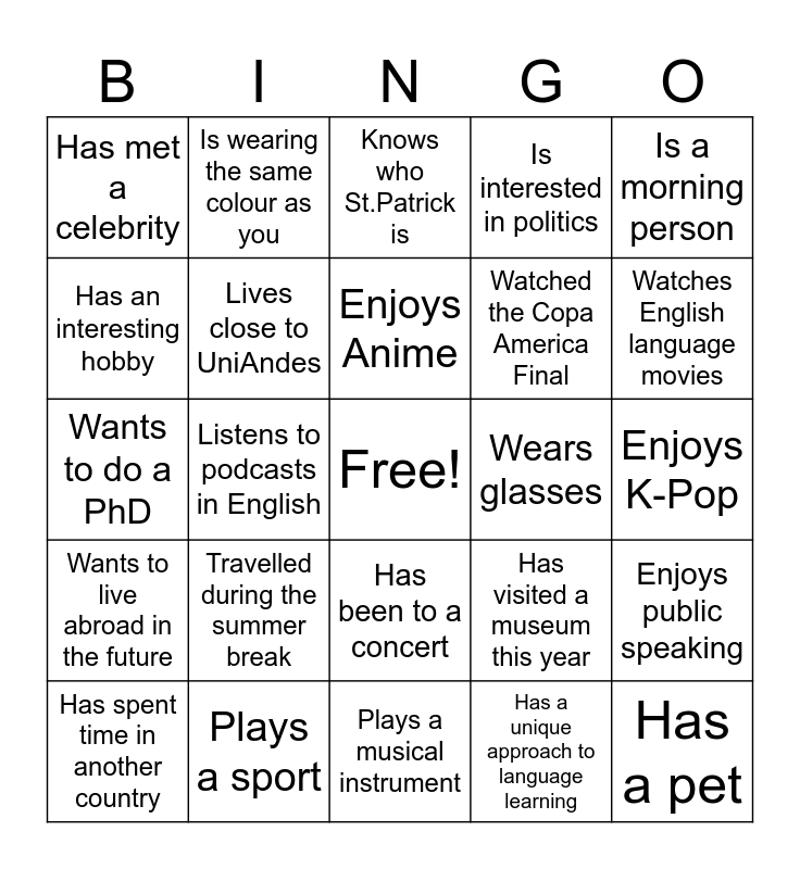 This bingo card has a free space and 24 words: Travelled during the summer break, Plays a sport, Enjoys Anime, Has spent time in another country, Is a morning person, Has met a celebrity, Has an interesting hobby, Is wearing the same colour as you, Wears glasses, Has been to a concert, Watched the Copa America Final, Wants to do a PhD, Has visited a museum this year, Enjoys public speaking, Lives close to UniAndes, Has a unique approach to language learning, Enjoys K-Pop, Knows who St.Patrick is, Watches English language movies, Listens to podcasts in English, Has a pet, Wants to live abroad in the future, Is interested in politics and Plays a musical instrument.