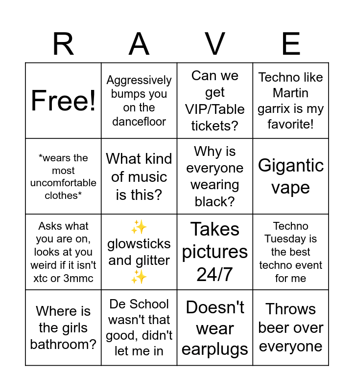This bingo card has 16 words: Where is the girls bathroom?, De School wasn't that good, didn't let me in, Can we get VIP/Table tickets?, Techno like Martin garrix is my favorite!, *wears the most uncomfortable clothes*, Aggressively bumps you on the dancefloor, Takes pictures 24/7, Techno Tuesday is the best techno event for me, Free!, What kind of music is this?, Doesn't wear earplugs, Gigantic vape, Asks what you are on, looks at you weird if it isn't xtc or 3mmc, ✨️ glowsticks and glitter ✨️, Why is everyone wearing black? and Throws beer over everyone.