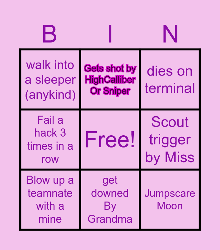 This bingo card has a free space and 8 words: Scout trigger by Miss, dies on terminal, Gets shot by HighCalliber Or Sniper, Blow up a teamnate with a mine, walk into a sleeper (anykind), Jumpscare Moon, Fail a hack 3 times in a row and get downed By Grandma.