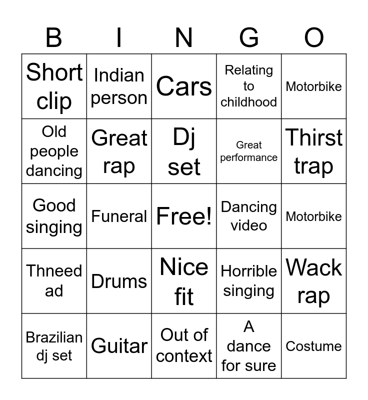 This bingo card has a free space and 24 words: Drums, Guitar, Dj set, Brazilian dj set, Motorbike, Short clip, Old people dancing, Indian person, Dancing video, Nice fit, Great performance, Good singing, Horrible singing, Wack rap, Great rap, A dance for sure, Motorbike, Cars, Thirst trap, Funeral, Costume, Thneed ad, Relating to childhood and Out of context.